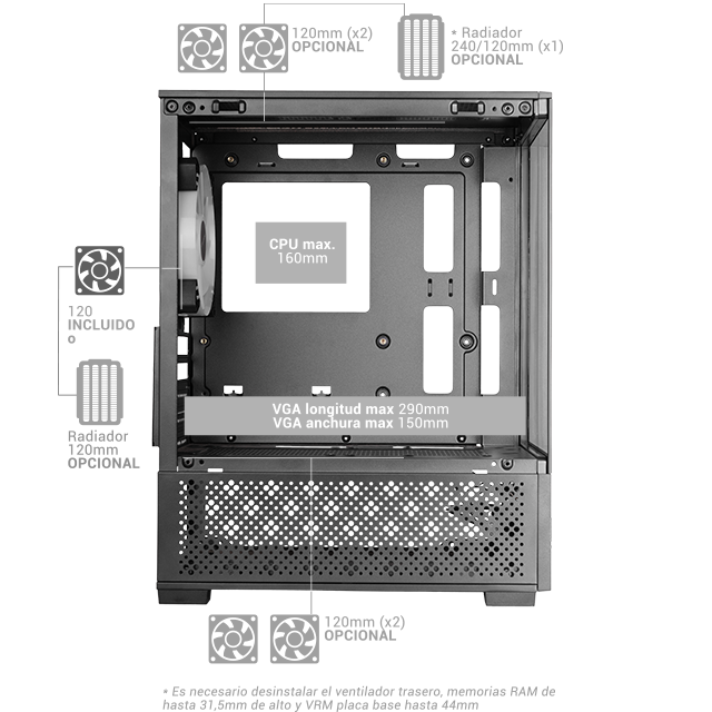 ● Bahias: 1x 3.5 ● Color Del Producto: Negro ● Conectores: USB 3.0 x 1, USB 2.0 x 2, Audio In/Out ● F.A.: No ● Formato: Micro ATX ● Formato F.A.: ATX ● Medidas: 388 x 197 x 304 mm ● Otros: Cristal templado lateral y frontal Filtro superior magnético Ventilador trasero con iluminación FRGB ● USB 3.0: 1