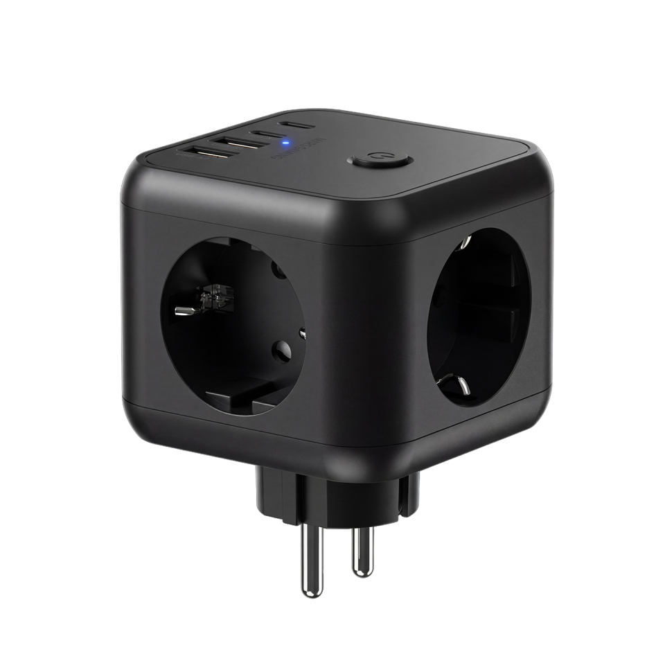 Cargador cubo GaN 20W negro con 3 Schuko y 4 USB (2xUSB-C + 2xUSB-A)