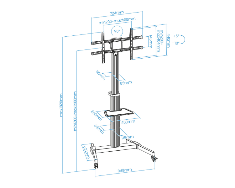 De 37 a 86"/ VESA Máximo 600x400mm/ Hasta 50kg/ Regulación de altura/ Bandeja regulable
