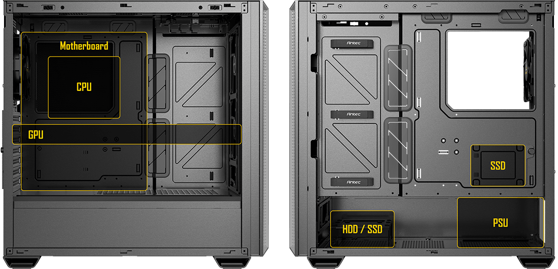 Mid Tower / GPU 405 mm / 2×SSD + 2×HDD / 2×USB 3.0 + 1×USB-C + Audio /